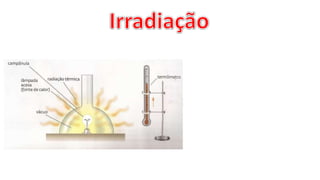 O documento descreve os processos de transferência de calor por radiação, incluindo emissão, absorção, reflexão e transmissão. A energia radiante é transportada por ondas eletromagnéticas e a faixa de frequência da radiação emitida depende da temperatura do corpo, com corpos a 300K (27°C) emitindo predominantemente no infravermelho.
