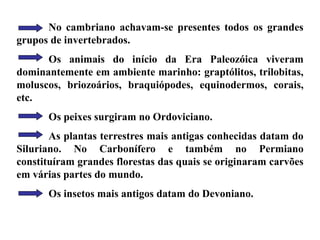 A Era Paleozóica durou cerca de 380 milhões de anos, entre 540-245 milhões de anos atrás. Durante este período surgiram e se diversificaram os principais grupos de invertebrados marinhos, como trilobitas e moluscos. Plantas terrestres surgiram no Siluriano e florestas se desenvolveram no Carbonífero e Permiano. Répteis apareceram no Carbonífero.