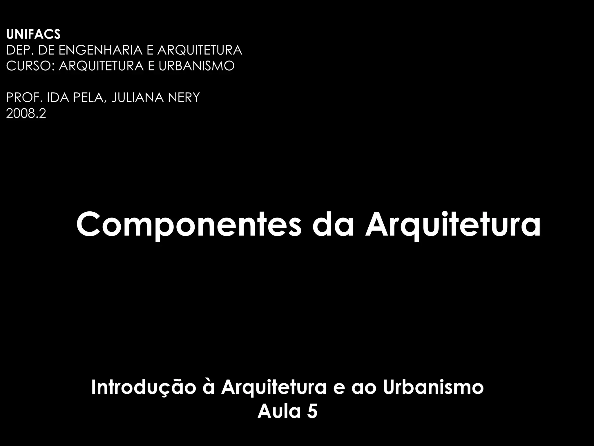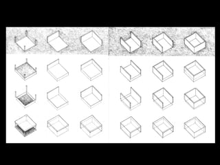 O documento discute os principais componentes da arquitetura, incluindo volume, elementos definidores do espaço como planos, dimensões e proporções, e elementos de articulação espacial como escadas e corredores. Exemplos de obras arquitetônicas ilustram esses conceitos, como a Casa da Música em Porto e o Pavilhão Alemão na Exposição de Barcelona projetado por Mies van der Rohe.