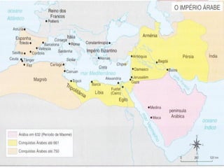 O documento descreve as principais características da Europa Ocidental e Oriental durante a Alta Idade Média. Na Europa Ocidental, destaca-se o Reino Franco e o desenvolvimento do feudalismo, enquanto a Igreja Católica ganhava poder. Na Europa Oriental, discute-se o Império Bizantino e a civilização árabe muçulmana, que se expandiu rapidamente sob o Califado.