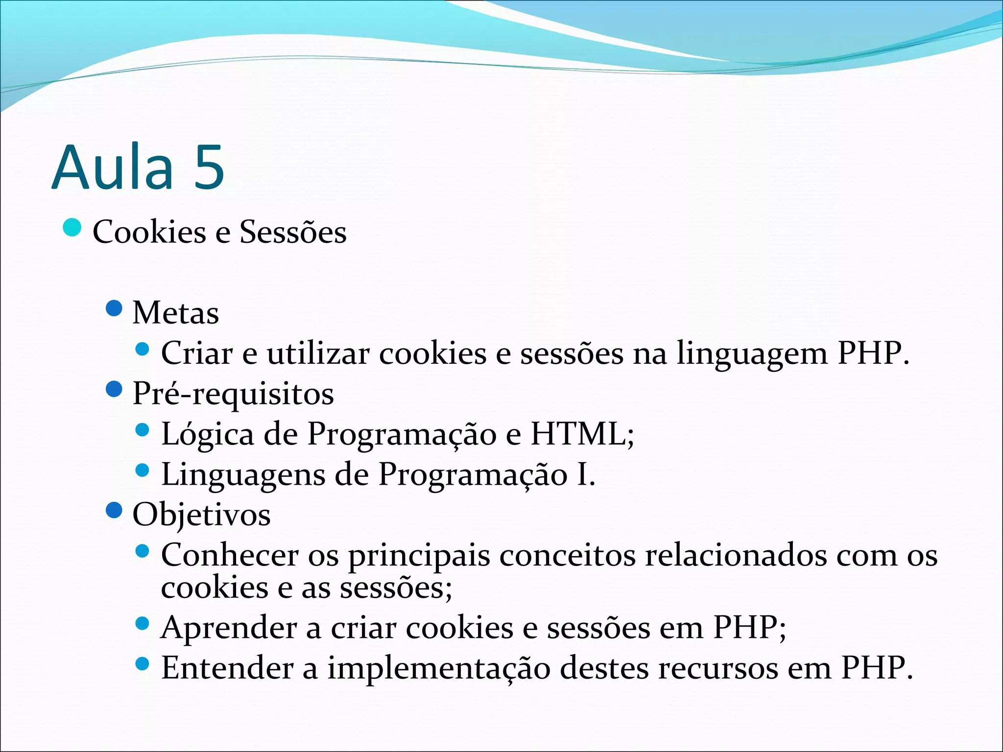 Este documento discute cookies e sessões em PHP, definindo-os como mecanismos para manter estado entre requisições HTTP. Ele explica como criar e usar cookies e sessões em PHP, armazenando informações no navegador do cliente ou no servidor respectivamente.