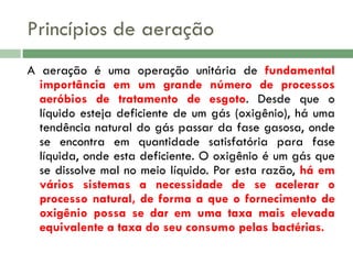 A aeração é um processo crucial no tratamento de águas residuárias, facilitando a dissolução de oxigênio no líquido para suprir a demanda das bactérias. Existem métodos como a aeração por ar difuso e a aeração superficial, que promovem a transferência de oxigênio através da difusão molecular e turbulenta. Fatores como temperatura, características do esgoto e geometria do reator são determinantes na eficácia da transferência de oxigênio.