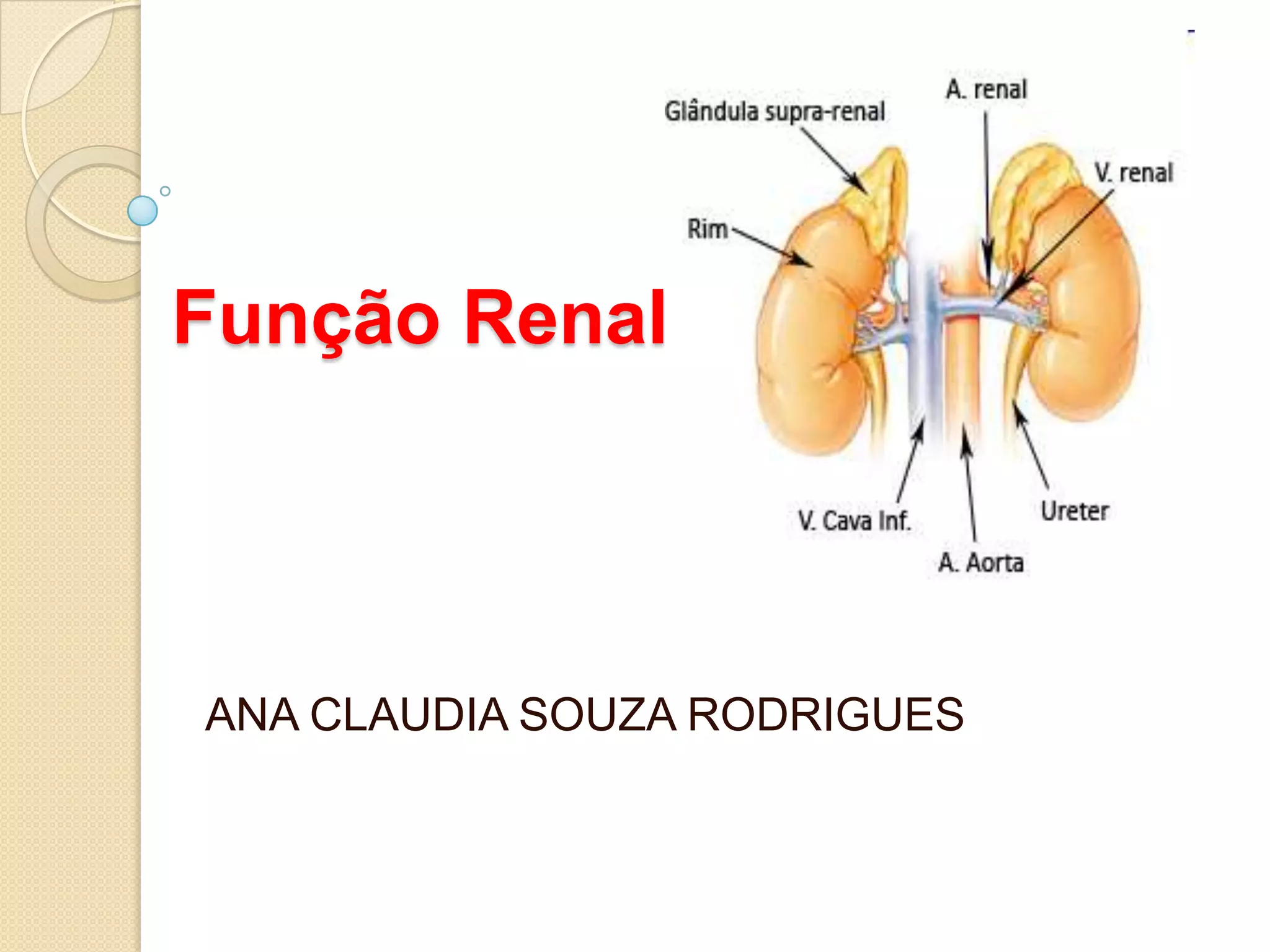 O documento descreve as principais funções do rim, incluindo o balanço hídrico e salino, excreção de compostos nitrogenados, regulação ácido-base e controle da pressão arterial. Detalha o processo de filtração glomerular e reabsorção tubular na formação da urina, além de marcadores comuns de função renal como creatinina e ureia. Apresenta também distúrbios ácido-base e suas causas, além de principais patologias renais como glomerulonefrite.