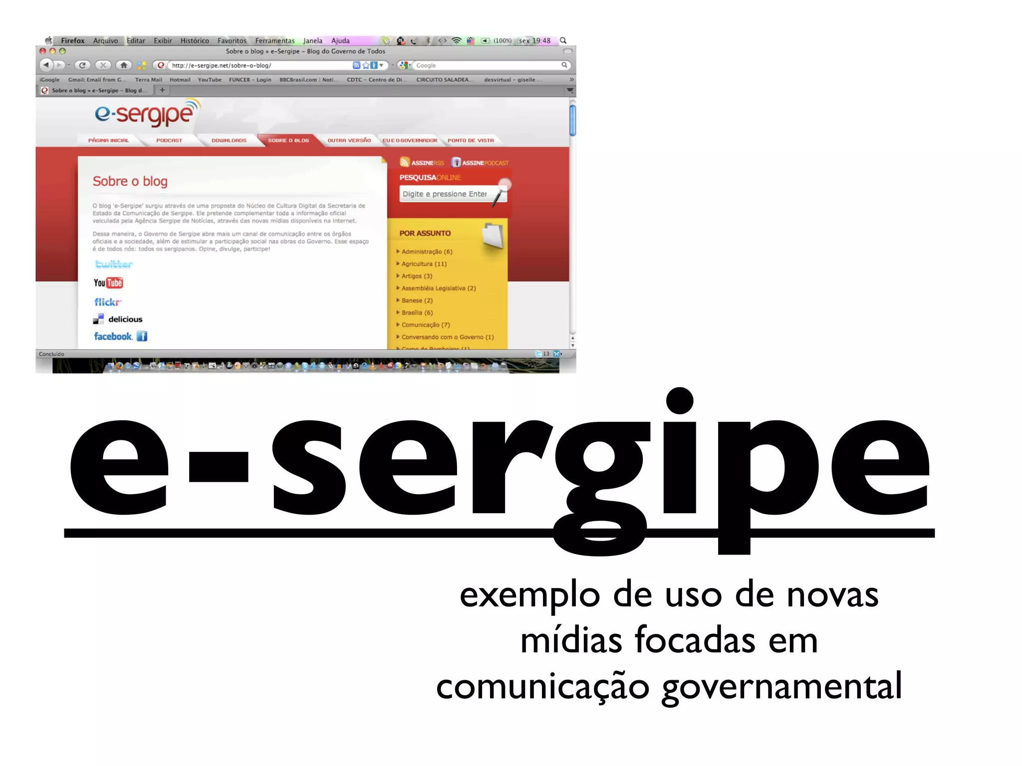 O documento descreve o site e-sergipe.net, um portal governamental com design limpo e cores vibrantes que fornece informações, respostas a críticas, links para outros meios e conteúdo em vídeo, áudio e imagens para promover a convergência com redes sociais, com o objetivo de comunicar o governo de forma acessível aos cidadãos.