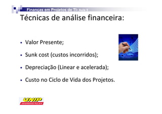 O documento discute conceitos financeiros relacionados a projetos de TI, incluindo cálculo de valor presente de fluxos de caixa, retorno sobre investimento, lucro residual e valor econômico agregado. Ele também fornece exemplos numéricos de como calcular esses indicadores financeiros.