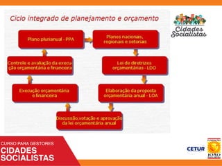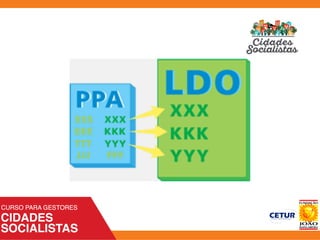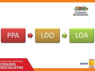 1) O documento apresenta as principais leis orçamentárias que regem o planejamento governamental: Plano Plurianual (PPA), Lei de Diretrizes Orçamentárias (LDO) e Lei Orçamentária Anual (LOA).