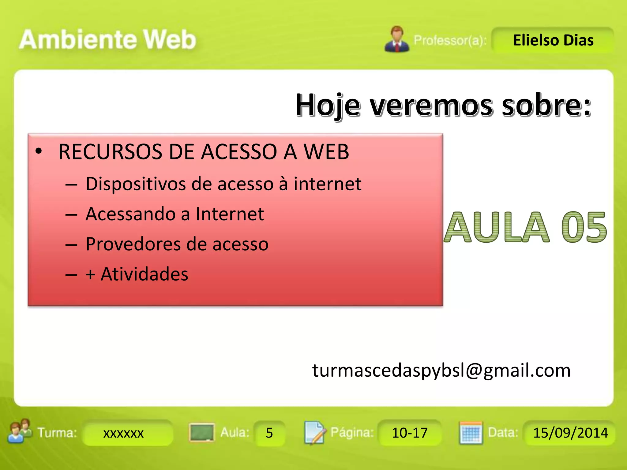 O documento discute os dispositivos e métodos de acesso à internet no Brasil, incluindo o alto uso de smartphones, tablets e lan houses. É explicado que o Brasil tem 27 milhões de usuários de smartphones, à frente da França e Alemanha. Métodos comuns de acesso incluem GPRS, Wi-Fi, Bluetooth, 3G e infravermelho. Provedores como UOL, IG e GVT fornecem acesso à internet banda larga.
