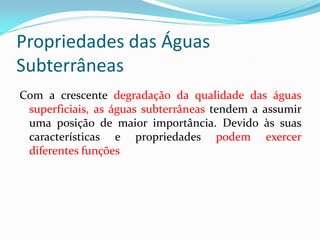 O documento discute as propriedades e funções das águas subterrâneas, incluindo armazenamento, filtragem, transporte e fornecimento de água. Também aborda as principais ameaças à qualidade da água subterrânea, como contaminação por atividades agrícolas, industriais e de disposição de resíduos. Explora como os aqüíferos se tornam contaminados através da infiltração de poluentes na superfície e como avaliar a vulnerabilidade dos aqüíferos.