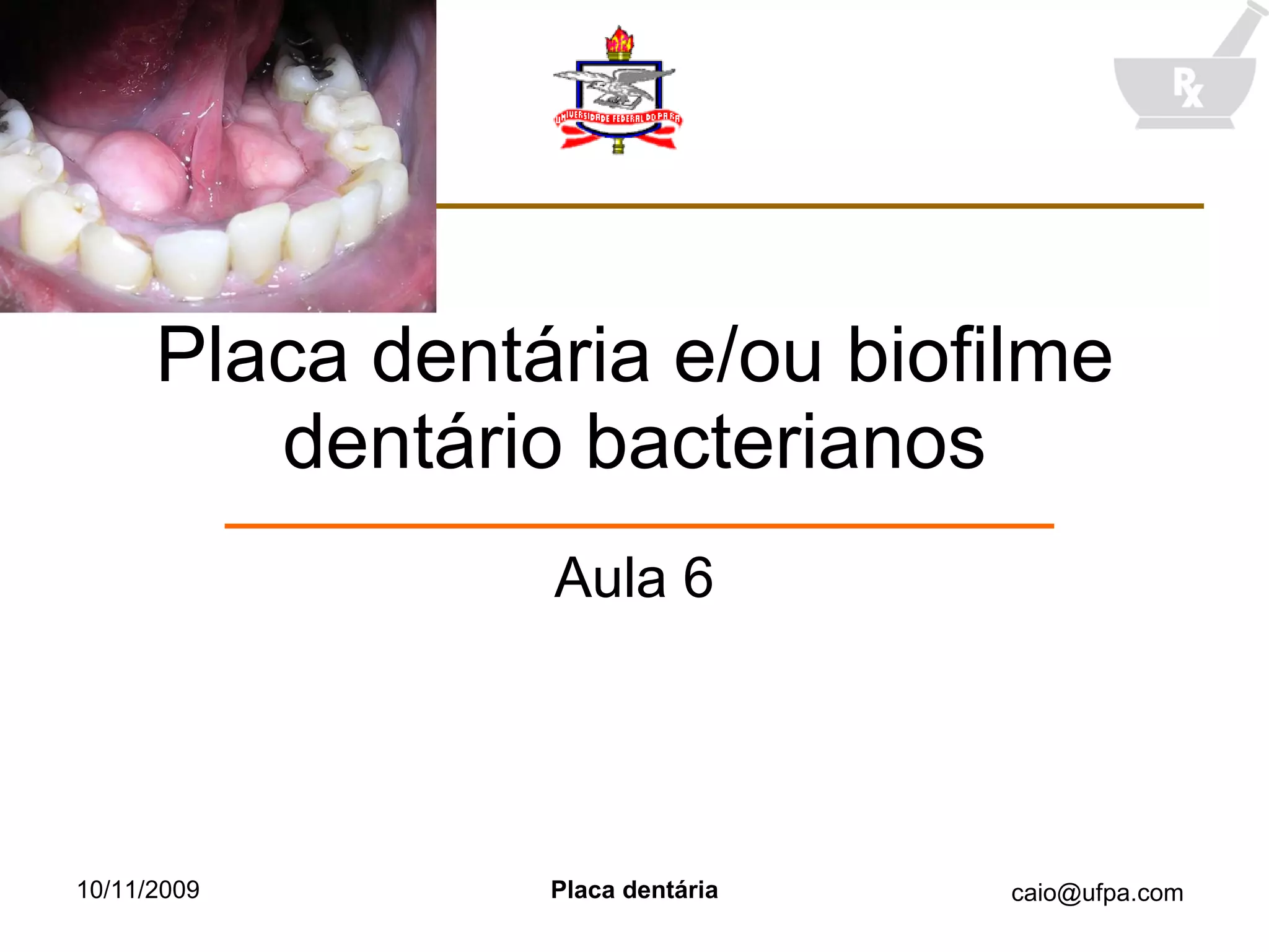 O documento discute a placa dentária bacteriana e biofilmes, incluindo sua formação, composição microbiológica, e relação com doenças como cárie e periodontite. Também aborda agentes antiplaca como clorexidina e flúor, além do potencial uso de bacteriófagos no tratamento da placa.