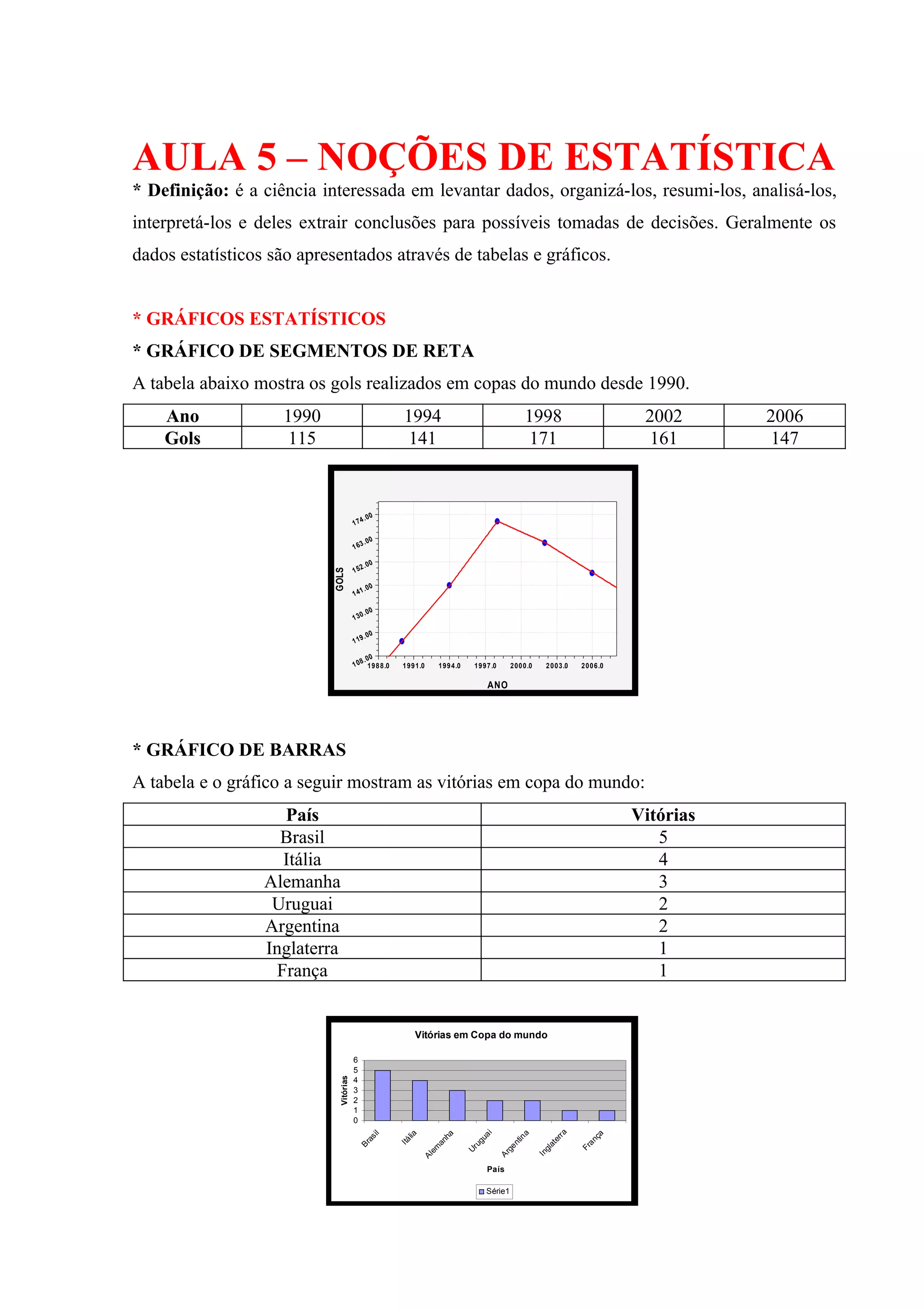 O documento apresenta conceitos básicos de estatística e exemplos de gráficos estatísticos, incluindo gráficos de segmentos de reta e barras para ilustrar dados sobre copas do mundo, como gols marcados, público, cartões amarelos e vitórias por país. Exercícios pedem para criar gráficos representando outros dados como participações e jogos de países em copas.