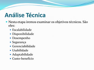 O documento descreve os objetivos técnicos de um projeto de rede, incluindo escalabilidade, disponibilidade, desempenho, segurança, gerenciabilidade, usabilidade, adaptabilidade e custo-benefício. Ele também discute a análise da rede existente, cobrindo a avaliação da topologia física e lógica, aplicações, protocolos, endereçamento, limitações, disponibilidade, desempenho, gerenciamento, segurança e tráfego.