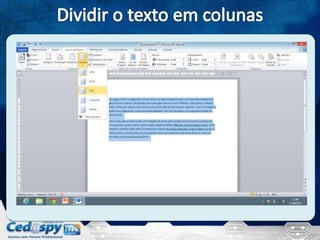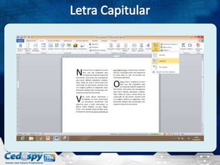 O documento discute a produção de documentos profissionais, mencionando colunas, quebras de texto, páginas e letras capitulares. Ele também aborda layout, fotos e figuras em jornais, estilo colunado em editores de texto e a formatação de textos em colunas com letras capitulares.