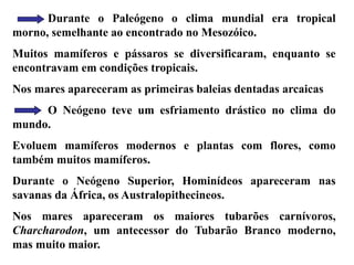 Durante o período Cenozóico (65 Ma - presente), o mundo assumiu sua forma moderna. O período Terciário (65-2 Ma) foi dividido em Paleógeno e Neógeno, durante os quais os mamíferos e aves se diversificaram sob condições tropicais no Paleógeno e mamíferos e plantas modernas evoluíram no Neógeno, quando o clima esfriou. Hominídeos surgiram na África no Neógeno Superior. No período Quaternário (2 Ma -