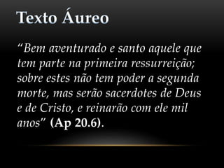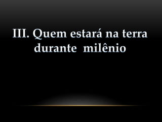 1. O Milênio é um período de mil anos em que Cristo reinará na Terra após a Grande Tribulação e antes do juízo final, de acordo com Apocalipse 20.