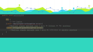 O documento resume conceitos fundamentais de Java como exceptions, coleções e pacotes. Discute como tratar exceptions, as principais interfaces de coleção como List e Set e a importância de organizar classes em pacotes significativos. O objetivo final é criar um projeto usando MySQL, Excel e conceitos aprendidos.