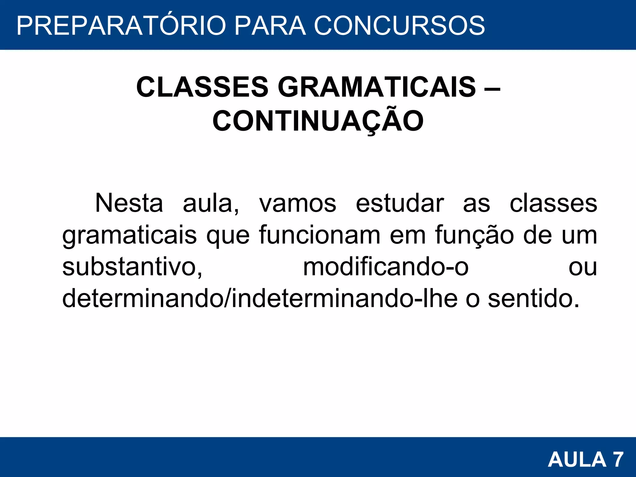 CLASSES GRAMATICAIS –CONTINUAÇÃO Nesta aula, vamos estudar as classes gramaticais que funcionam em função de um substantivo, modificando-o ou determinando/indeterminando-lhe o sentido. PROAB 2010 AULA 7 PREPARATÓRIO PARA CONCURSOS