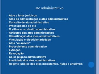 O documento discute os atos administrativos, definindo-os como manifestações unilaterais da administração pública que produzem efeitos jurídicos. Apresenta os conceitos de ato perfeito, válido e eficaz, e os atributos dos atos administrativos como presunção de legitimidade, autoexecutoriedade e tipicidade. Por fim, aborda temas como classificação, extinção e invalidade dos atos administrativos.