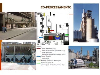 O documento discute o processo de co-processamento, no qual resíduos industriais são reutilizados na produção de cimento. O co-processamento envolve a mistura homogênea de resíduos e matérias-primas, e sua queima em fornos de cimento a altas temperaturas, destruindo componentes orgânicos e inertizando componentes inorgânicos. O documento descreve os cuidados necessários com transporte, armazenamento, saúde e segurança no processo.