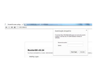 O documento fornece instruções para configurar um modem ADSL e roteador para acessar a internet, incluindo como descobrir o endereço IP do modem, configurar o PPPoE, VPI, VCI e credenciais da operadora, e definir configurações de rede no computador para acessar o roteador.
