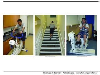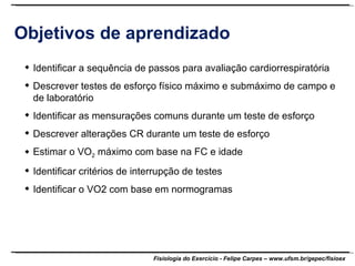 O documento descreve protocolos e procedimentos para testes de esforço cardiorrespiratório máximo e submáximo. Ele discute como medir variáveis como frequência cardíaca, consumo de oxigênio máximo e distância percorrida para avaliar a aptidão física de indivíduos. O documento também fornece diretrizes gerais para a interpretação dos resultados e a seleção segura de testes de acordo com fatores como idade e risco do avaliado.