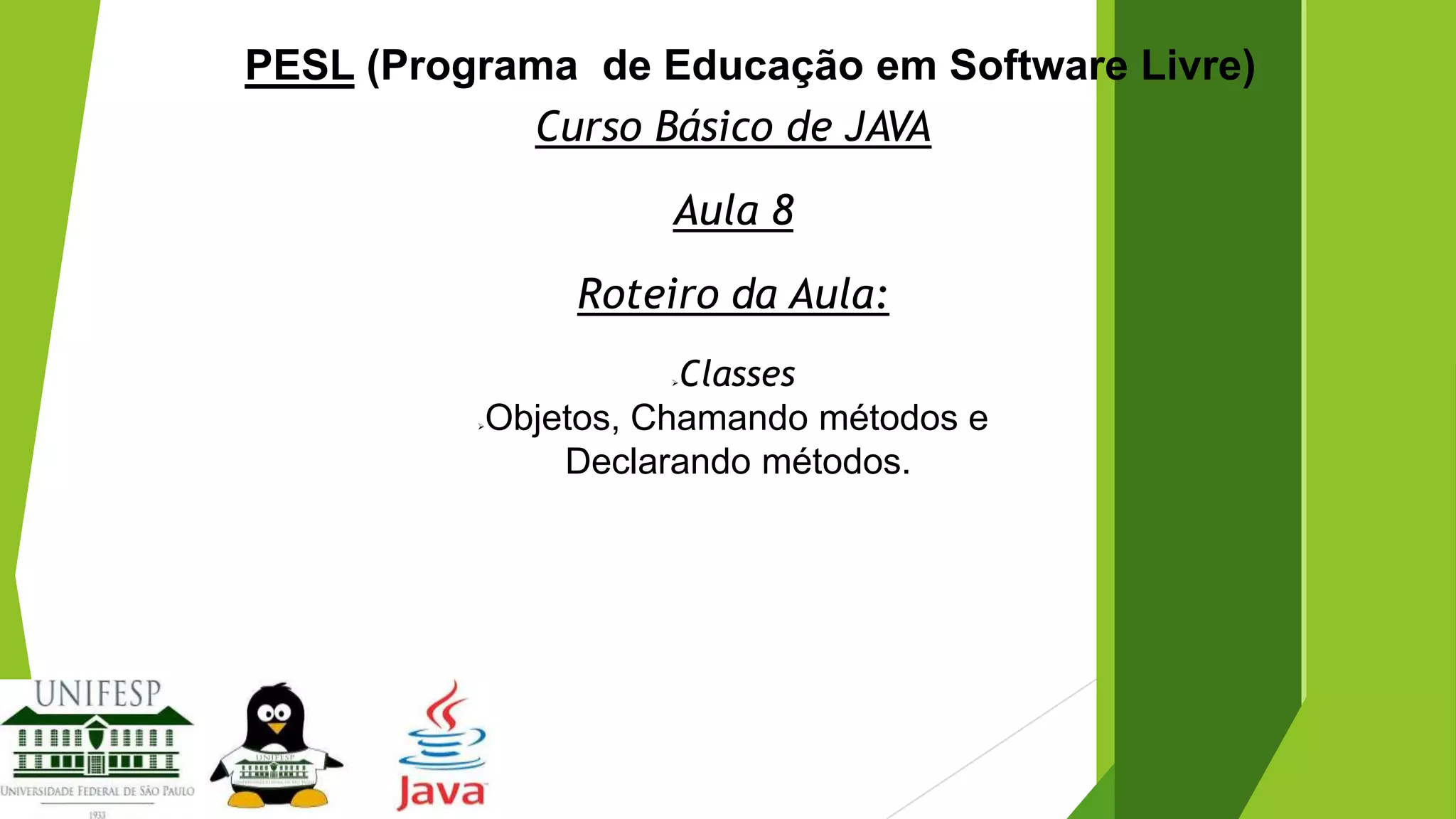 Este documento apresenta uma aula sobre classes, objetos, métodos e declaração de métodos em Java. Ele introduz classes para representar polígonos como Quadrado e Retângulo e mostra como criar objetos dessas classes. Também explica como declarar e chamar métodos, incluindo o uso de valores de retorno e argumentos. Por fim, fornece a sintaxe completa para declaração de métodos.