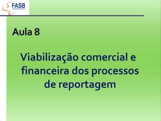 O documento discute a viabilização financeira e comercial dos processos de reportagem, incluindo a importância do orçamento para prever custos e alocar recursos, além de formas de mensurar resultados e avaliar o sucesso das ações por meio de pesquisas, análise de mídia e métricas de engajamento. Também aborda a necessidade de apresentar planos de forma clara para obter apoio dos executivos e acompanhar a execução por meio de controles e relatórios.