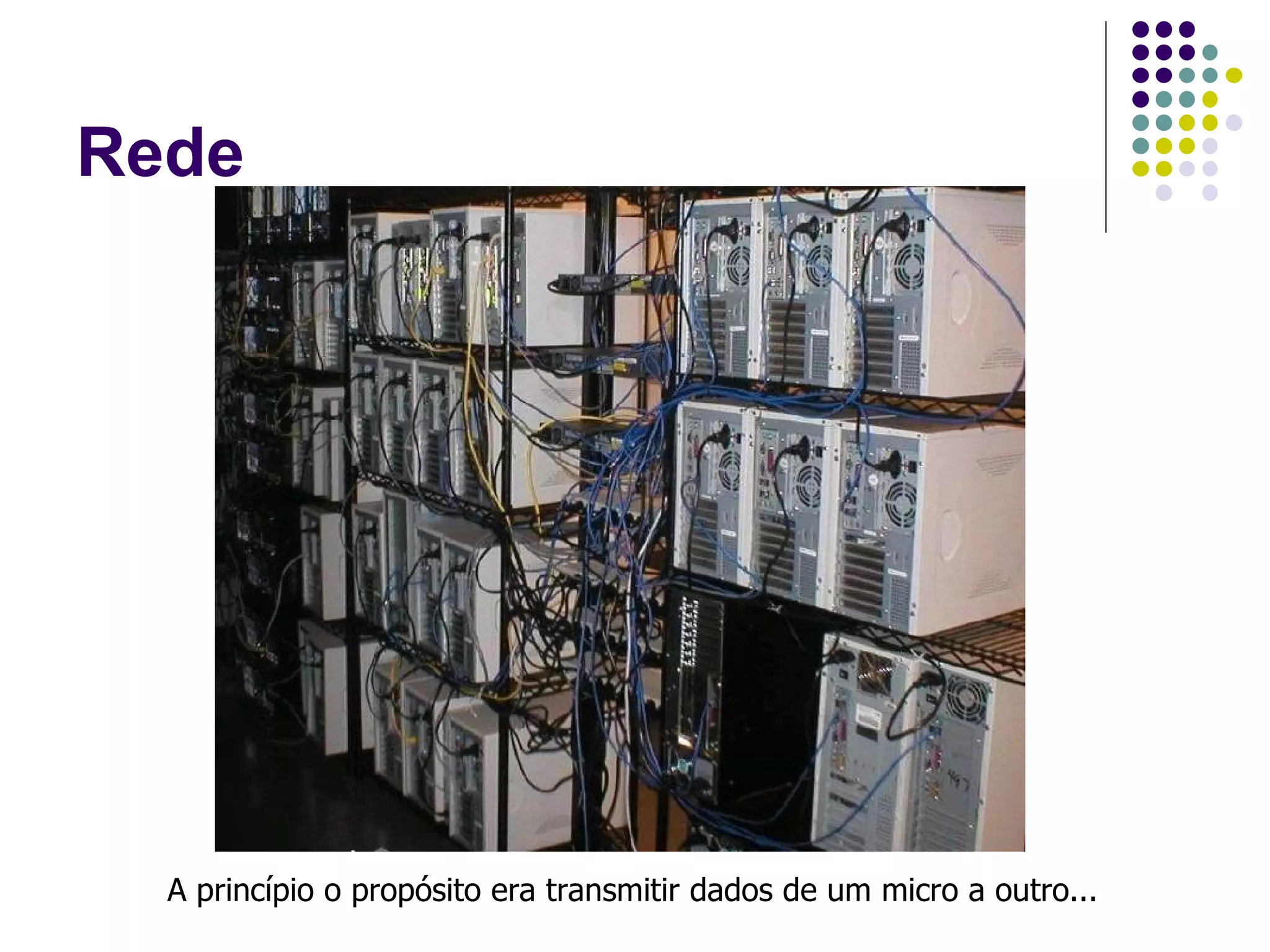 O documento descreve os principais componentes e conceitos de redes de computadores, incluindo hardware, software, protocolos e topologias. Detalha os tipos de cabos e redes sem fio mais comuns, além de dispositivos como hubs, switches e roteadores necessários para interligar os nós e otimizar o tráfego na rede.