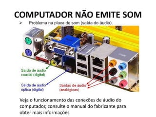 O documento discute possíveis problemas em computadores e suas soluções, incluindo quando o computador não emite som, fica lento, ou inicializa mas não gera imagem na tela. É fornecido um modelo de como funcionam as conexões de áudio e possíveis causas e soluções para problemas como grande carga de programas, superaquecimento e infecção por vírus.