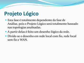 Este documento descreve o projeto lógico e físico de uma rede. Ele discute as etapas de projeto lógico como dividir a rede em LAN com fio, LAN sem fio e WAN e organizar os equipamentos logicamente. Também aborda o projeto físico usando um sistema de cabeamento estruturado e suas vantagens.