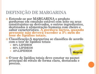 O documento descreve processos de fabricação de margarina e maionese, incluindo: