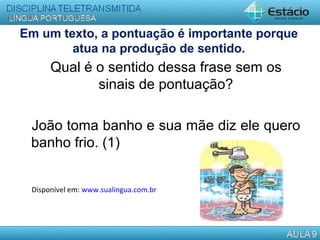 1) A pontuação é importante para produzir sentido em um texto. Um exemplo mostra como a falta de pontuação torna uma frase incompreensível.