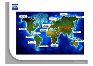 O documento aborda os principais blocos econômicos mundiais, como a União Europeia, NAFTA, Pacto Andino, APEC, ASEAN e Mercosul, destacando suas características, objetivos e relações comerciais. O Mercosul, por exemplo, visa eliminar barreiras comerciais e promover a integração econômica entre os países membros da América Latina. Além disso, discute a evolução do Mercosul em direção a maior integração, incluindo desafios e avanços atuais.