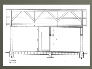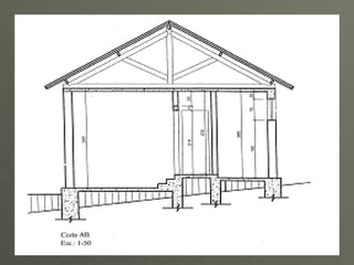 O documento explica o que são cortes em construção civil, mostrando detalhes de alturas, espaços internos e estrutura. Ele também fornece recomendações sobre como traçar cortes corretamente, como escala, locais, detalhes e nomenclaturas a serem utilizadas. Por fim, apresenta especificações técnicas de telhados e telhas.