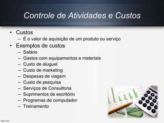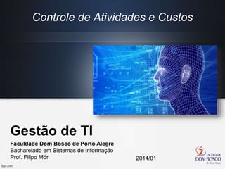 O documento aborda o controle de atividades e custos na gestão de TI, destacando a importância da administração de custos e a apropriação de despesas em projetos. É apresentado um conjunto de métricas de desempenho para diferentes equipes, visando otimizar processos e resultados. Além disso, menciona a terceirização como uma estratégia de gestão que proporciona simplicidade e dinamismo.