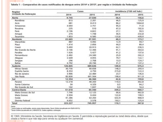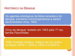 O documento resume informações sobre dengue, incluindo seu histórico, transmissão, sintomas, diagnóstico e tratamento. Apresenta quatro sorotipos do vírus da dengue e discute o Aedes aegypti como seu principal vetor de transmissão. Também fornece detalhes sobre a epidemia de dengue no Brasil e em Mato Grosso do Sul entre 2007-2015.