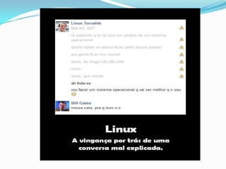 O documento apresenta os principais sites sobre Linux, em seguida discute a história do Linux, seu criador Linus Torvalds e a licença GPL. Também apresenta as vantagens do Linux, suas principais distribuições e conceitos básicos sobre o sistema operacional.