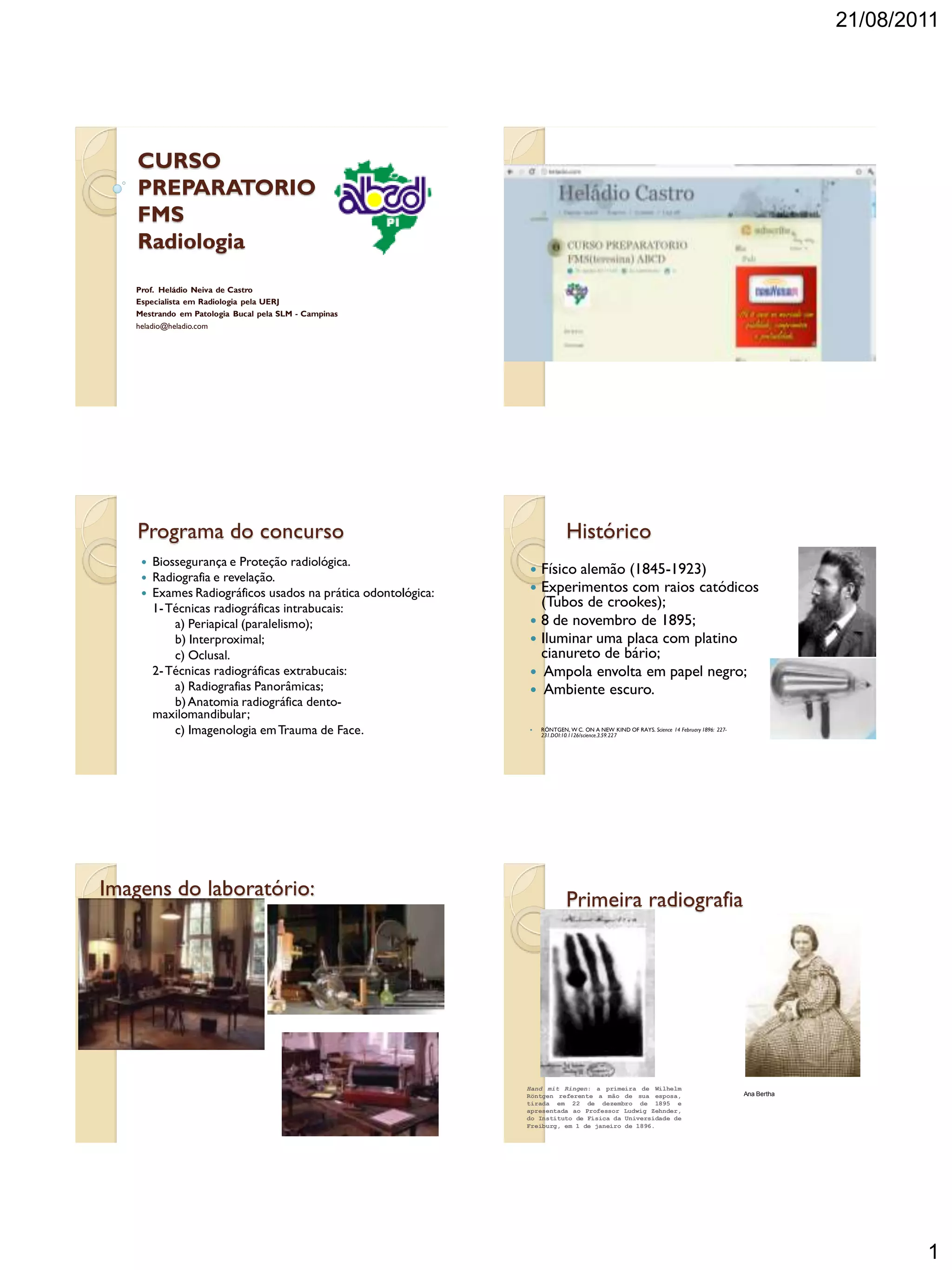 O documento descreve um curso preparatório de radiologia odontológica, incluindo o histórico da radiologia, equipamentos de raio X, anatomia radiográfica dento-maxilo-mandibular e perguntas sobre o assunto. O professor é especialista em radiologia e mestre em patologia bucal. O curso aborda biossegurança, técnicas radiográficas intra e extrabucais e exames usados na odontologia.