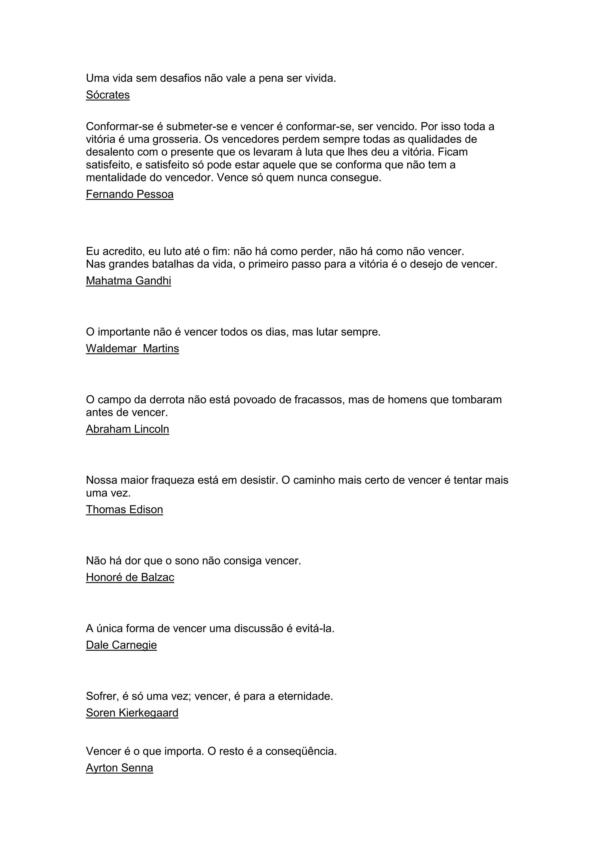Sócrates afirma que uma vida sem desafios não vale a pena ser vivida. Fernando Pessoa discorda, afirmando que vencer é se conformar e que a vitória é uma grosseria, pois os vencedores perdem suas qualidades de luta. Mahatma Gandhi acredita que o primeiro passo para a vitória é o desejo de vencer.