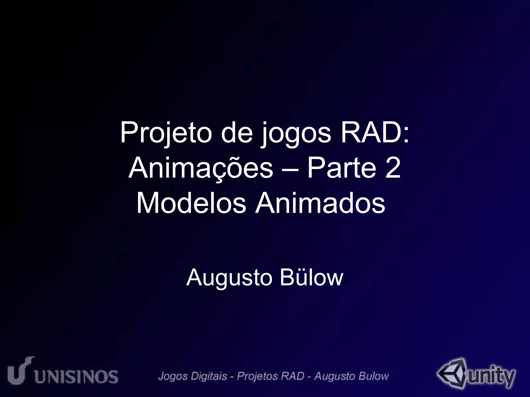O documento discute a importação e configuração de modelos animados no Unity3D, incluindo formatos de arquivo comuns, importação de animações separadas, atribuição de animações e scripts para controlar a reprodução das animações de acordo com ações do jogador.