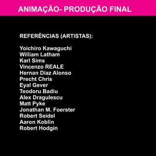 Este documento descreve os processos experimentais para a produção final de animação, incluindo: 1) pesquisa teórica e visual sobre artistas de animação 3D na arte contemporânea, 2) desenvolvimento de uma proposta teórica de acordo com as normas ABNT, 3) execução de um projeto prático em formato de vídeo AVI de 12 segundos, 4) entrega do trabalho em CD até 02 de dezembro sem prorrogação.