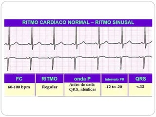 O documento descreve os principais componentes do sistema de condução cardíaco e do eletrocardiograma (ECG), incluindo ondas P, QRS, T e intervalos, além de abordar arritmias como fibrilação atrial, taquicardia ventricular e bradicardias.