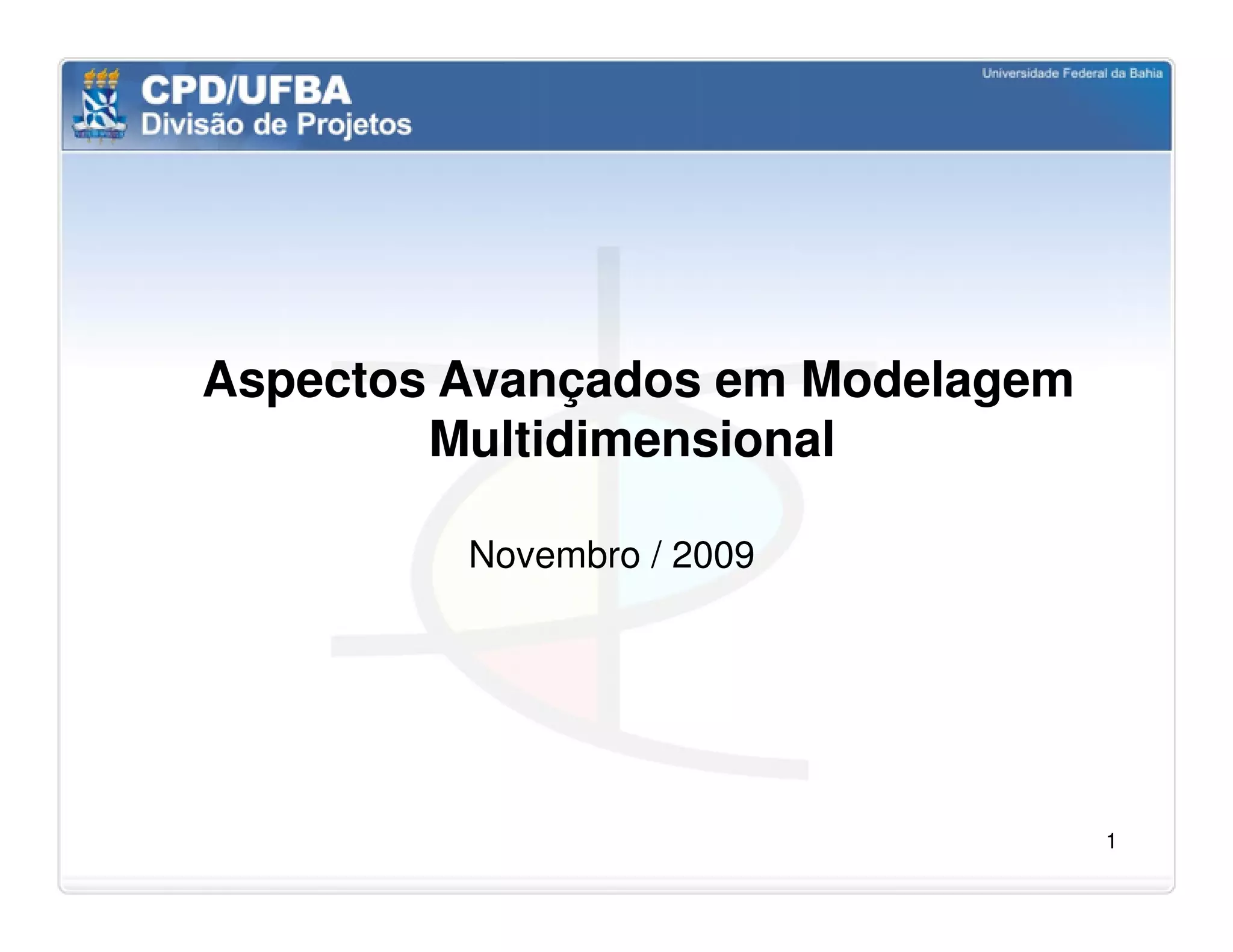 O documento discute vários aspectos avançados de modelagem dimensional, incluindo: (1) esquemas estrela e snowflake e suas variações, (2) dimensão tempo e como modelá-la, (3) dimensões que podem ter múltiplos papéis e (4) dimensões que evoluem no tempo (slowly changing dimensions).