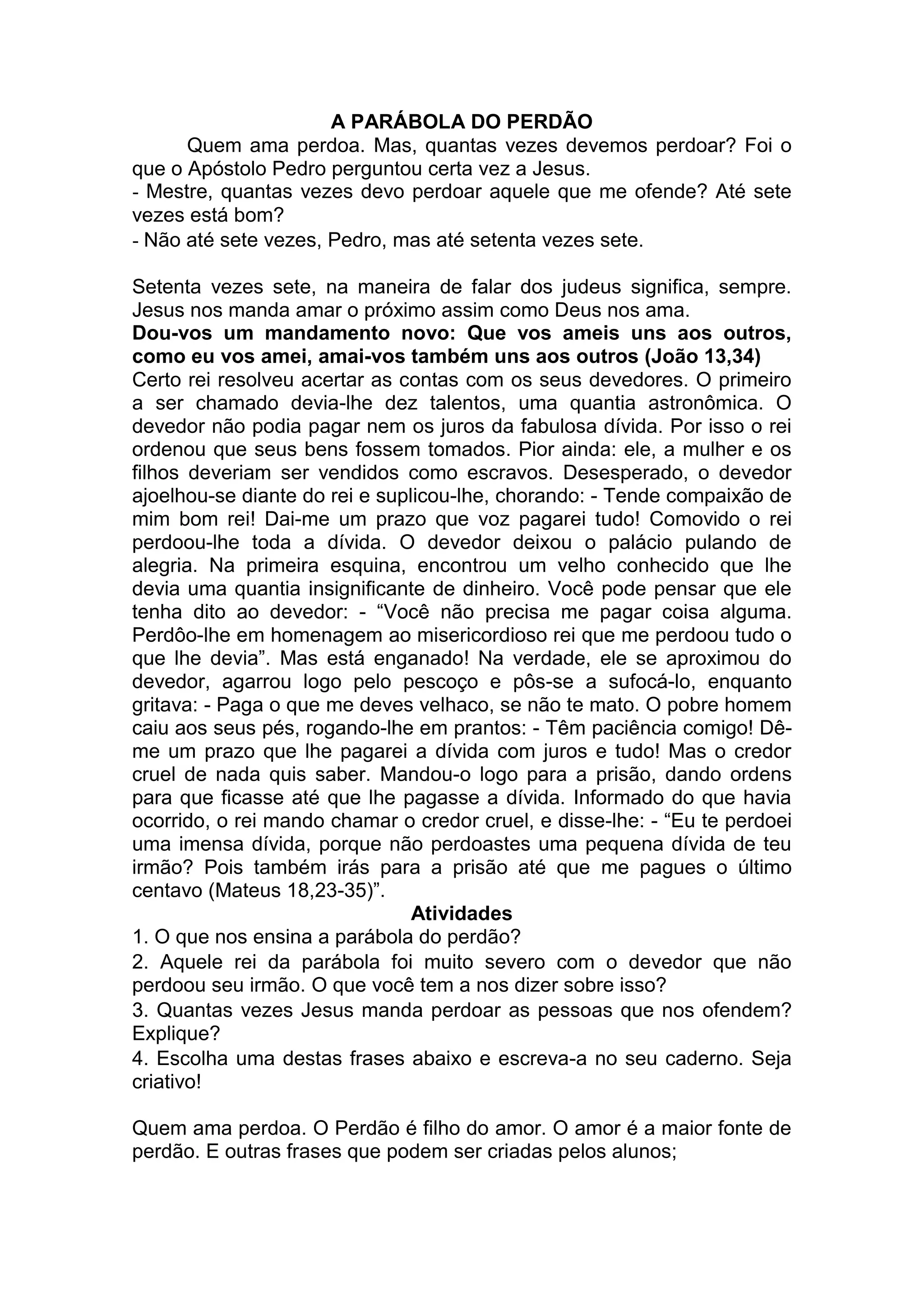 1) Jesus ensina que devemos perdoar sem limites, não apenas sete vezes, mas setenta vezes sete.