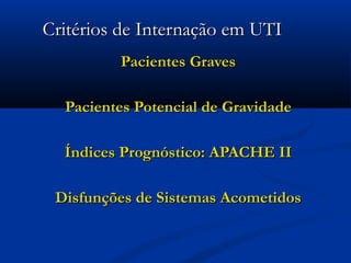 2. Inclui detalhes sobre critérios de admissão, avaliação de sistemas, disfunções orgânicas, índices respiratórios e protocolos de avaliação neurológica, hemodinâmica, inspecção, palpação, percussão e ausculta.