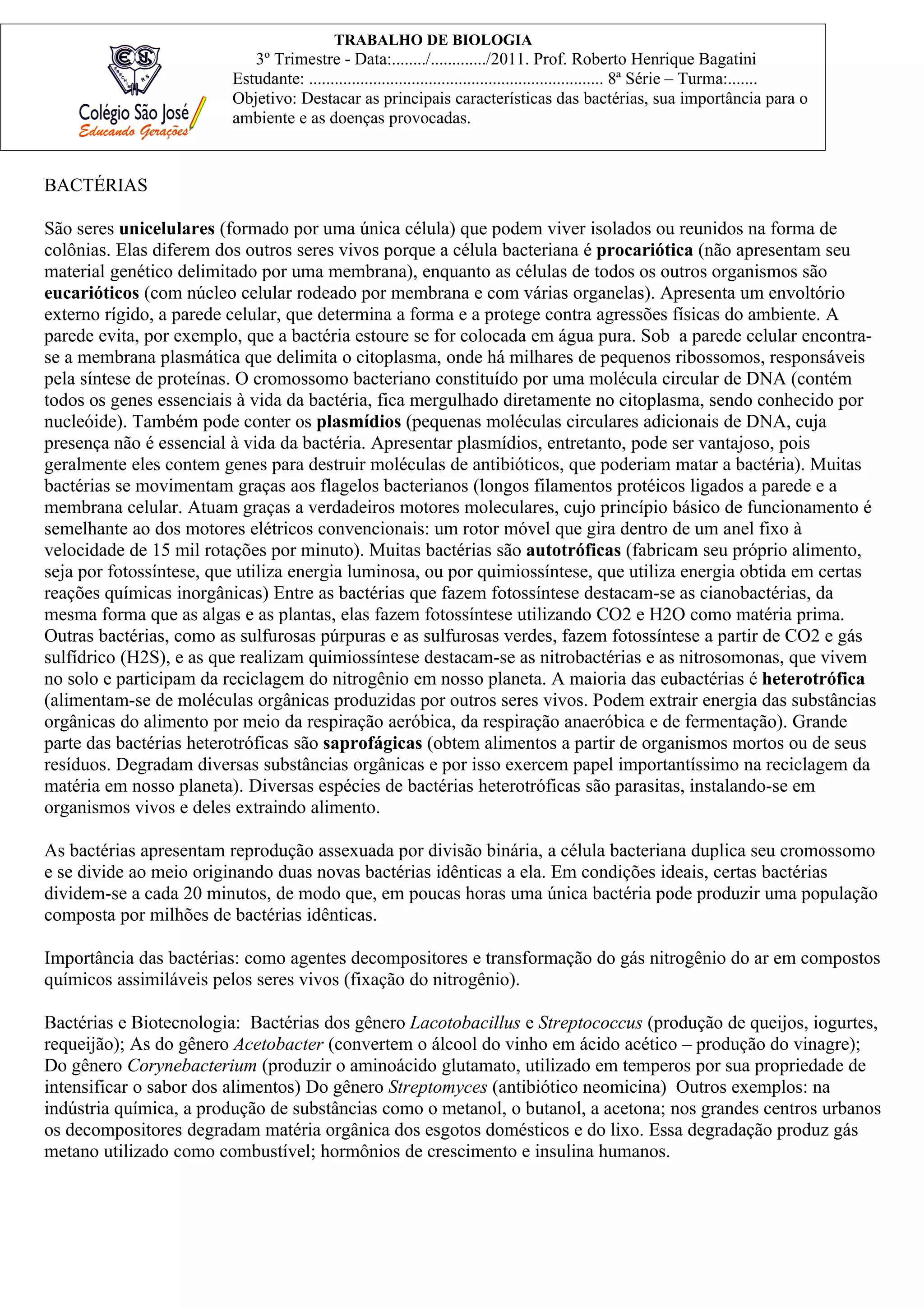 As bactérias são seres unicelulares procarióticos que podem se reproduzir rapidamente e desempenham papéis importantes na decomposição de matéria orgânica e na fixação de nitrogênio. Algumas bactérias causam doenças, enquanto outras são usadas em biotecnologia para a produção de alimentos e substâncias úteis. O documento descreve as características, importância ecológica, usos e classificação das bactérias.
