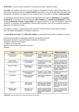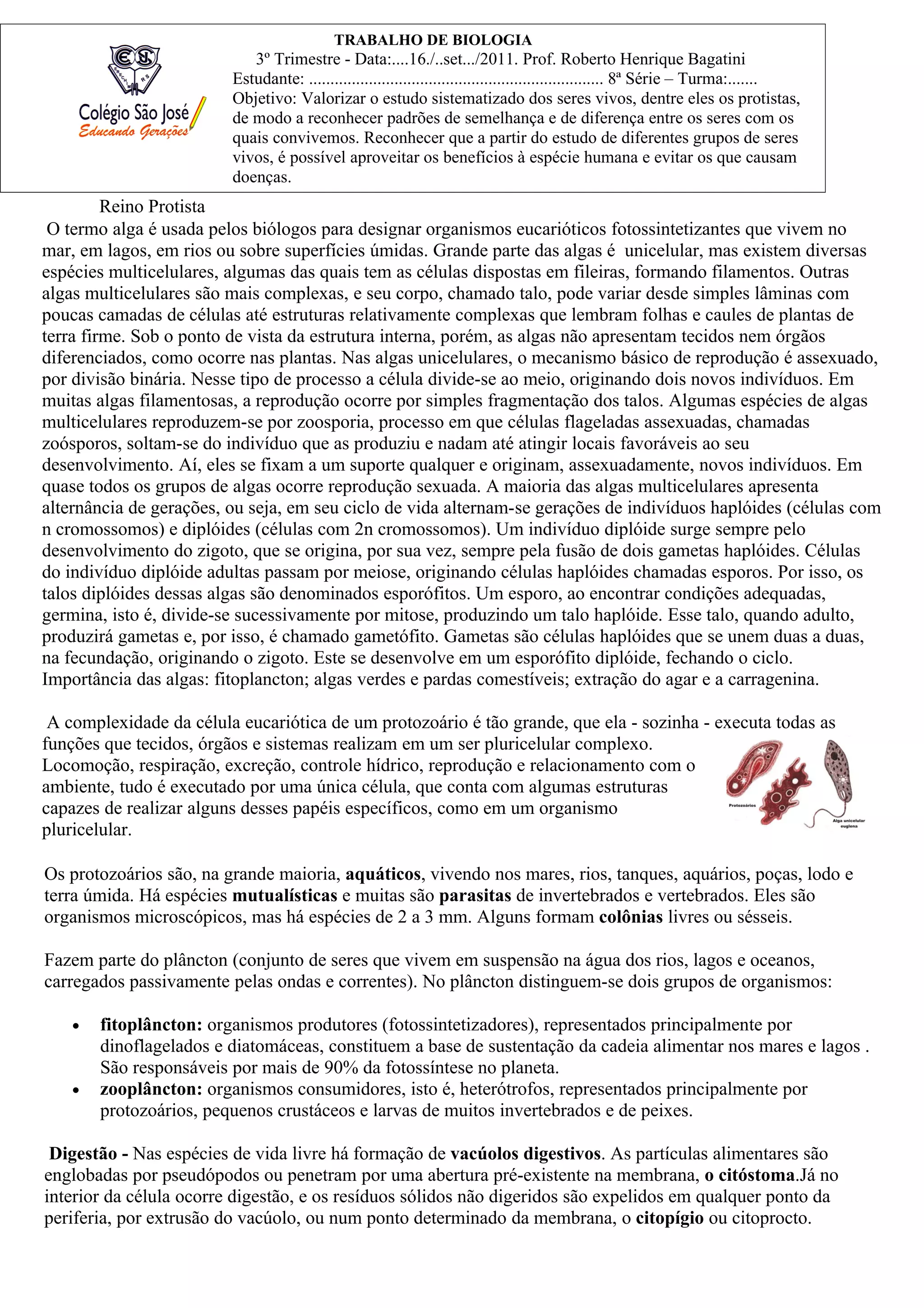 O documento descreve as características principais dos protistas, incluindo algas e protozoários. Discute a locomoção, digestão, respiração e reprodução destes organismos unicelulares, bem como sua importância no meio ambiente e algumas doenças causadas por protozoários.