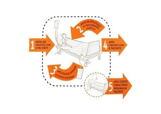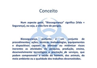 O documento discute biossegurança em ambientes de pesquisa e saúde. Ele define biossegurança e explica os riscos biológicos, as vias de transmissão de agentes biológicos, as precauções padrão e outras precauções como de contato e gotículas. Também fornece orientações sobre equipamentos de proteção individual, descarte de resíduos, imunização e tratamento de artigos médicos.