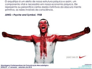 O documento discute os arquétipos psicológicos descritos por Carl Jung e como eles representam aspectos fundamentais da mente humana. Apresenta breves descrições de vários arquétipos como o Inocente, o Explorador, o Sábio, o Herói, o Fora-da-Lei e o Mago, explicando seus desejos básicos, medos, estratégias e dons.