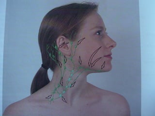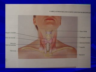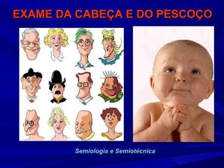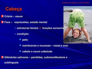 Este documento descreve o exame da cabeça e do pescoço, incluindo a inspeção e palpação de estruturas como o crânio, face, olhos, nariz, ouvidos, boca, pescoço, glândula tireóide e linfonodos. Fornece detalhes sobre os pontos a serem observados em cada estrutura anatômica durante o exame físico.