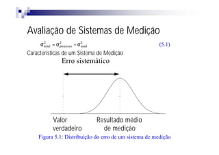 O documento discute a avaliação de sistemas de medição, incluindo cálculo de erros sistemáticos e aleatórios, repetitividade, reprodutibilidade e adequabilidade. Um exemplo mostra como calcular esses parâmetros para uma micrométrica usada em medições de peças de usinagem.